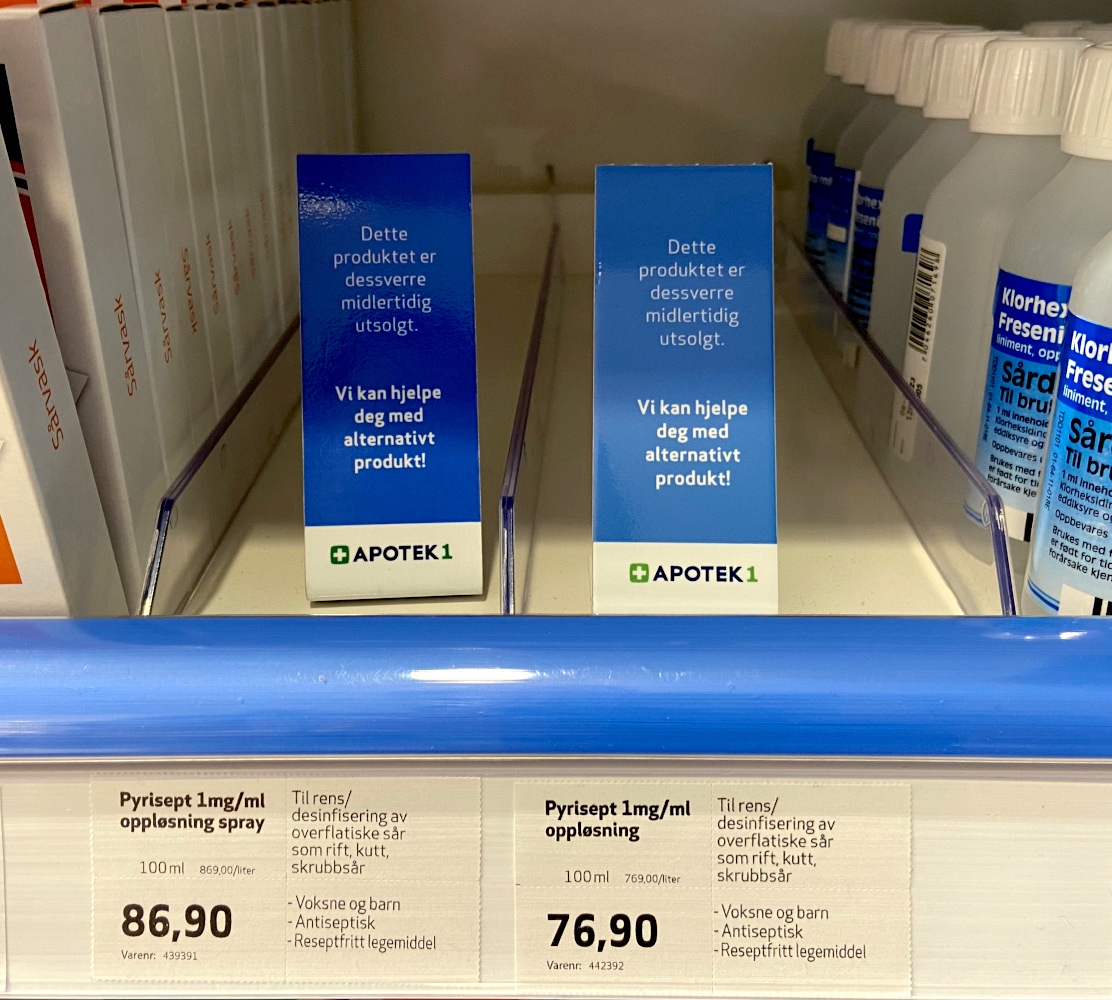 Rens og desinfiseringsproduktet pyrisept brukes i de fleste hjem for rensing av små og store sår og utstyr. Nå får ikke lenger apotekene produktet i 100ml flaske levert, det er blitt tomt i butikkhyllene.