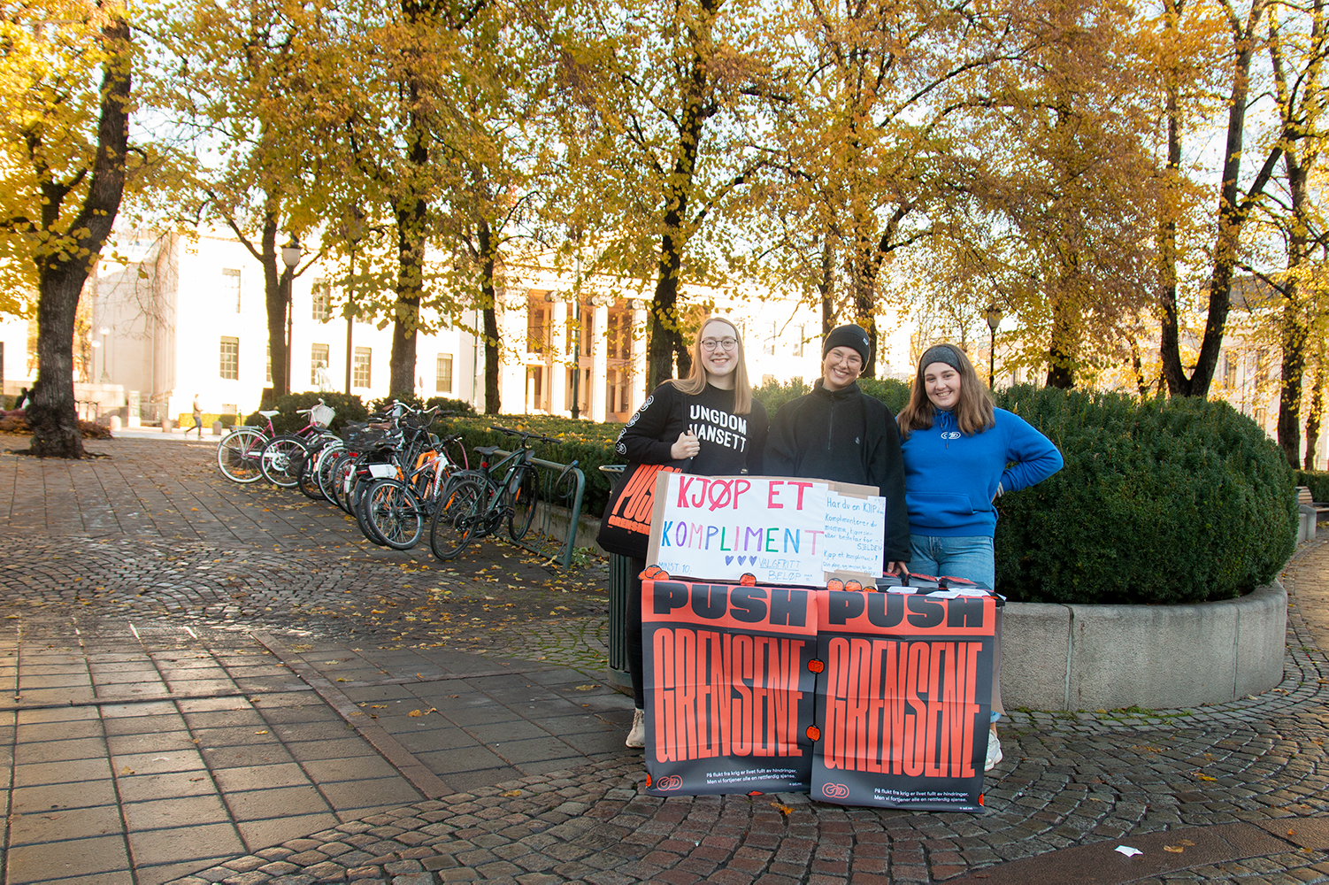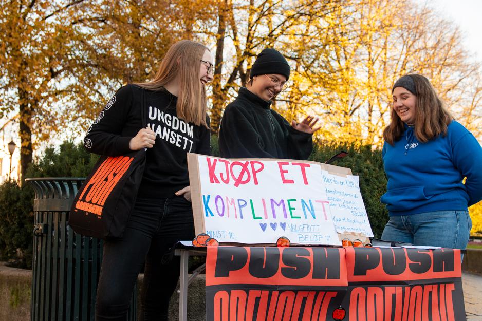 Foran bordet har de teipet fast et stort hjemmelaget skilt, hvor det står «kjøp et kompliment». Vipps penger, og de tre jentene gir deg hvert sitt kompliment. Kanskje har det større verdi enn saft og en kald bolle? De påpeker at de har fått mye støtte fra elever i tillegg til voksne, som har vært engasjerte i prosjektet og spurt spørsmål.