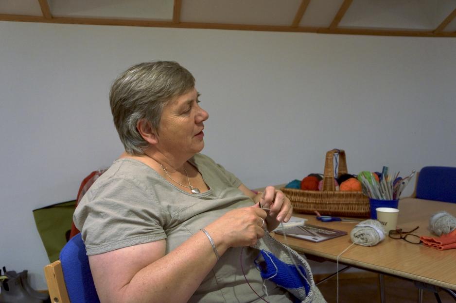– Vanligvis sitter vi litt unna langbordet, med de andre. Hvis det er noe vi lurer på så er det sikkert noen som jobber med det. Da tar vi en titt og får litt tips og triks, sier Maibritt Christensen, leder av strikkekurset.
