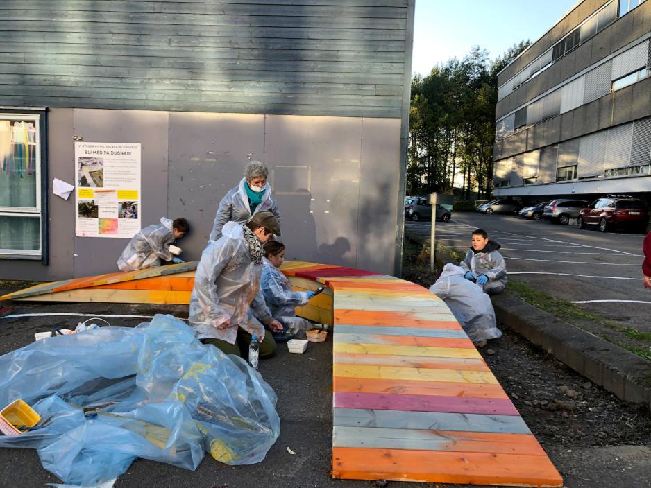 Det er ikke bare voksne beboere som er med på dugnaden – flere barn bidrar også i arbeidet. Med alt fra maling av benker, bæring av planker og valg av musikk som skal spilles, er barna involvert i prosessen.