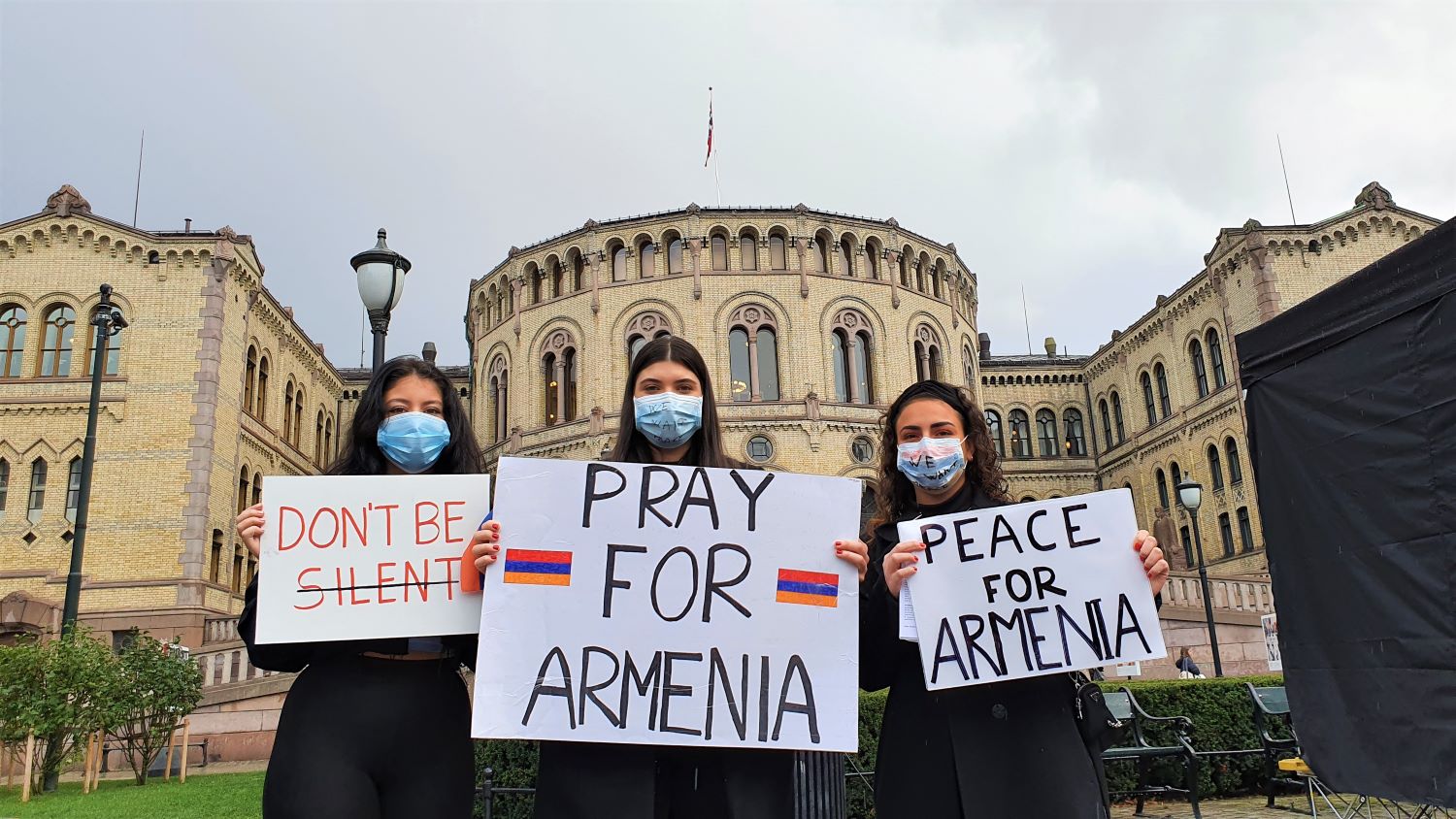En regnfull ettermiddag i oktober er plassen foran Stortinget tettpakket av demonstranter med munnbind og diverse plakater. Noen har farget munnbindene blått, rødt og oransje, fargene til det armenske flagget, mens plakatene kritiserer Tyrkia, Aserbajdsjan, og også den norske regjeringen. Midt på plassen står Liana Gukasyan, Edita Khachatrjan og Suniva Mosa og deler ut informasjonsark til alle som vil ha. De er alle 21 år, studenter og har armensk opphav.