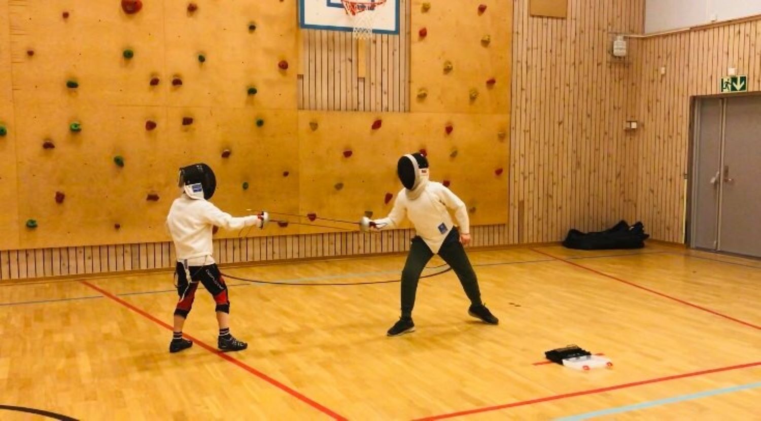 Stabekk skole på Bekkestua tilbyr fektekurs for barn og ungdom. Selv om samfunnet er stengt ned på grunn av koronapandemien, holder skolen fortsatt kurs.