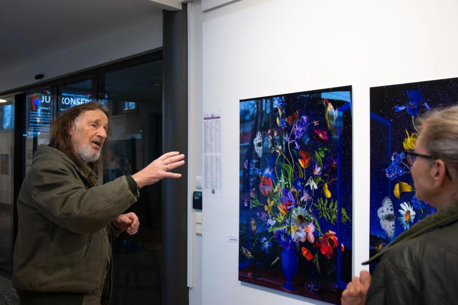 Rolf Sørensensen er kunstner og en av utstillerne. Denne lørdagen er det han som har ansvar for utstillingen, som brer seg ut på veggene i den granittlagte gangen i kommunehuset.