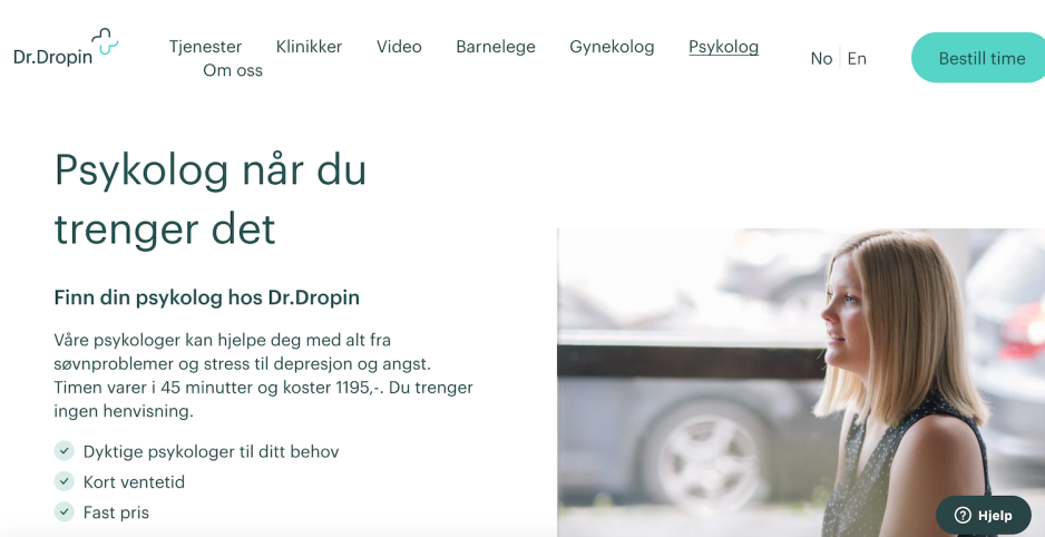 Dr. Dropin startet med psykologtilbud våren 2020, og tilbyr per dags dato psykologtimer på klinikken på Torshov og over video. Sophie Vonholm, intern i Dr.Dropin, svarer i mail at det er kort ventetid på psykologtime.