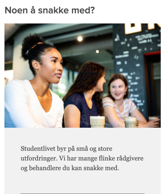 På SiO sine hjemmesider kan man se oversikt over hvilke tilbud de har. Blant annet samtalepartner, ’Walk and talk’ og bestille time til rådgiver/psykolog. Time hos psykolog eller rådgiver koster 100 kroner.