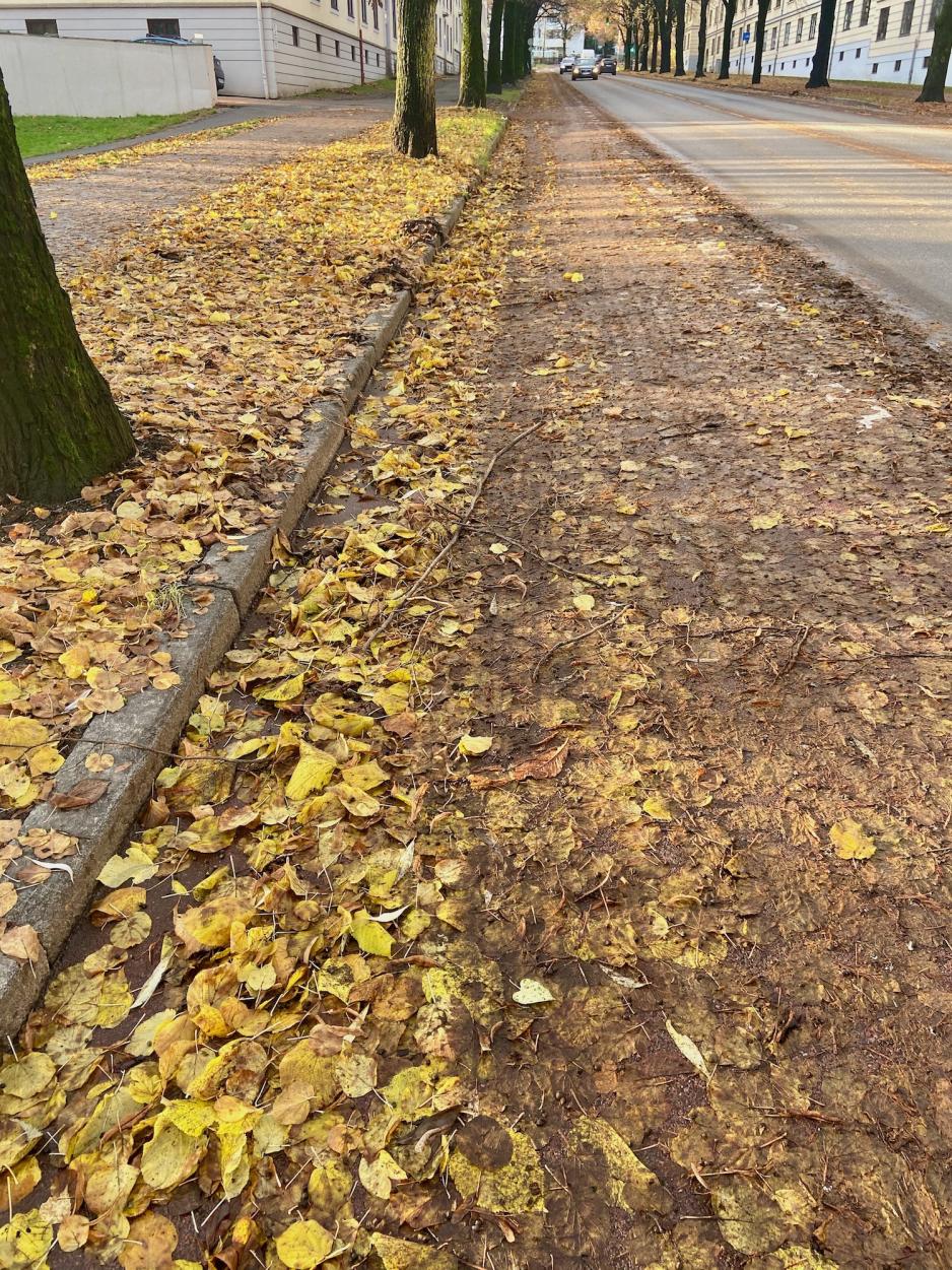 Syklister som sykler forbi forteller at de har irritert seg over mengden løv. Spesielt i bakker hvor man har høy fart, kan det by på farlige situasjoner. Syklistene kommenterer i forbifarten at kommunen bør rydde opp i løvet dersom de ønsker trygg ferdsel av syklister i byen.