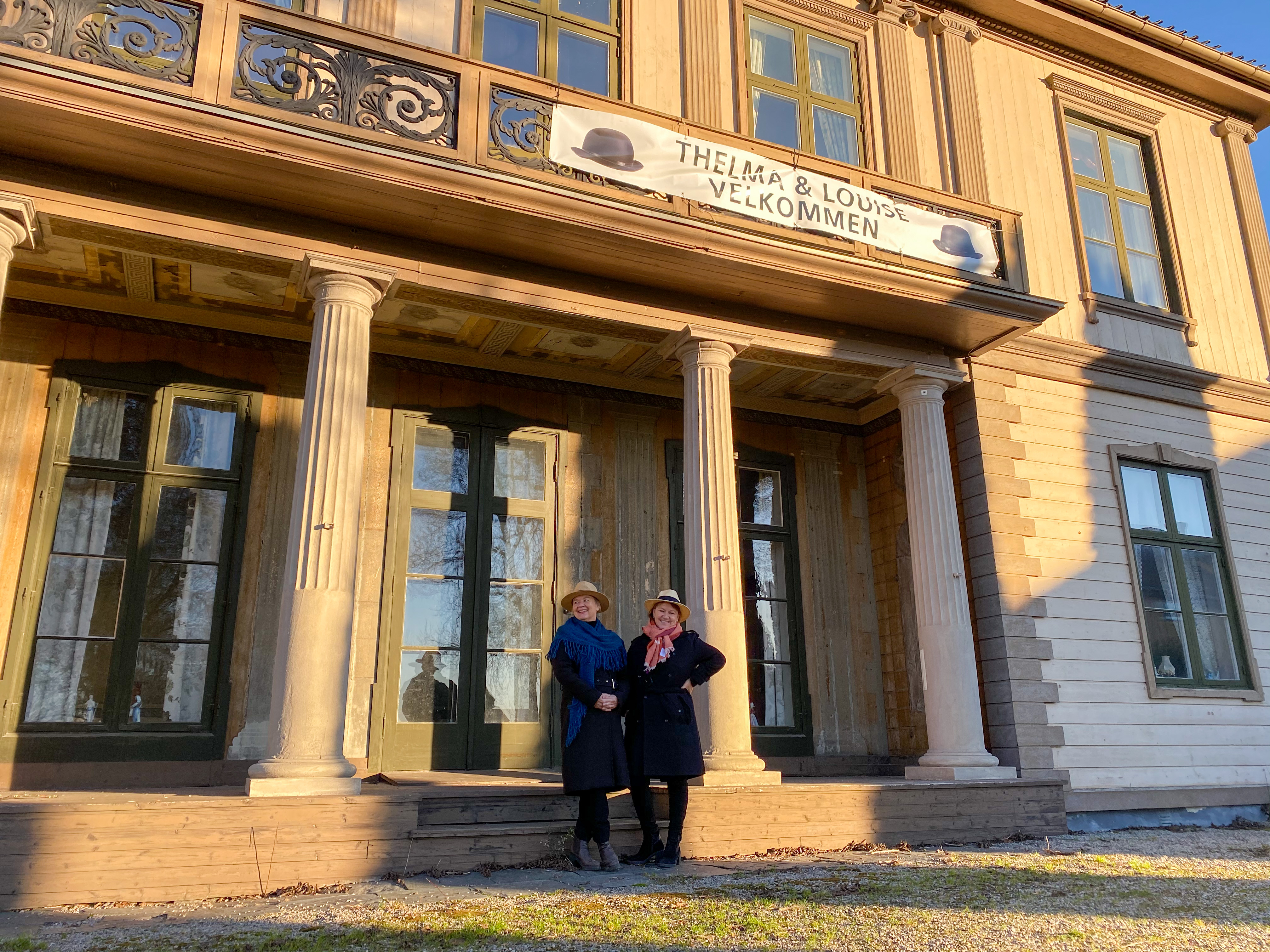 Statsbygg ga Helle Riis og Guri Danielsen nøkkelen til praktgården fra 1825, som har vært til salgs i over ett år. Stompafilmene ble til i dette bygget på 1960-tallet. Nå holder «Thelma & Louise» arrangementer der, i håp om at de en dag kan åpne bokhotell på stedet.