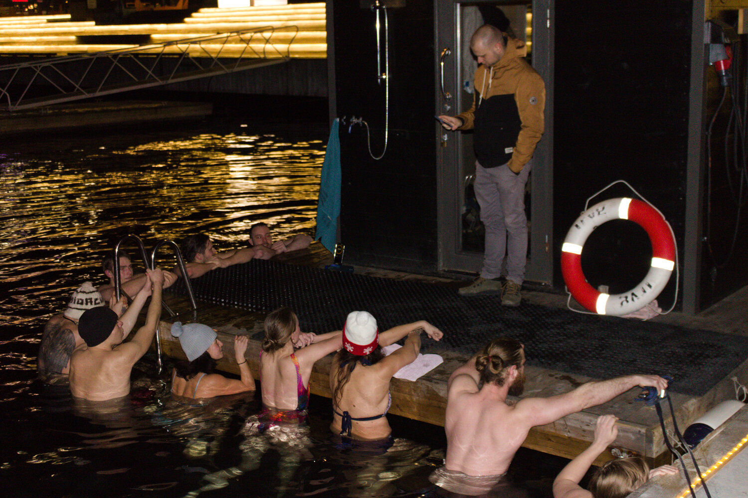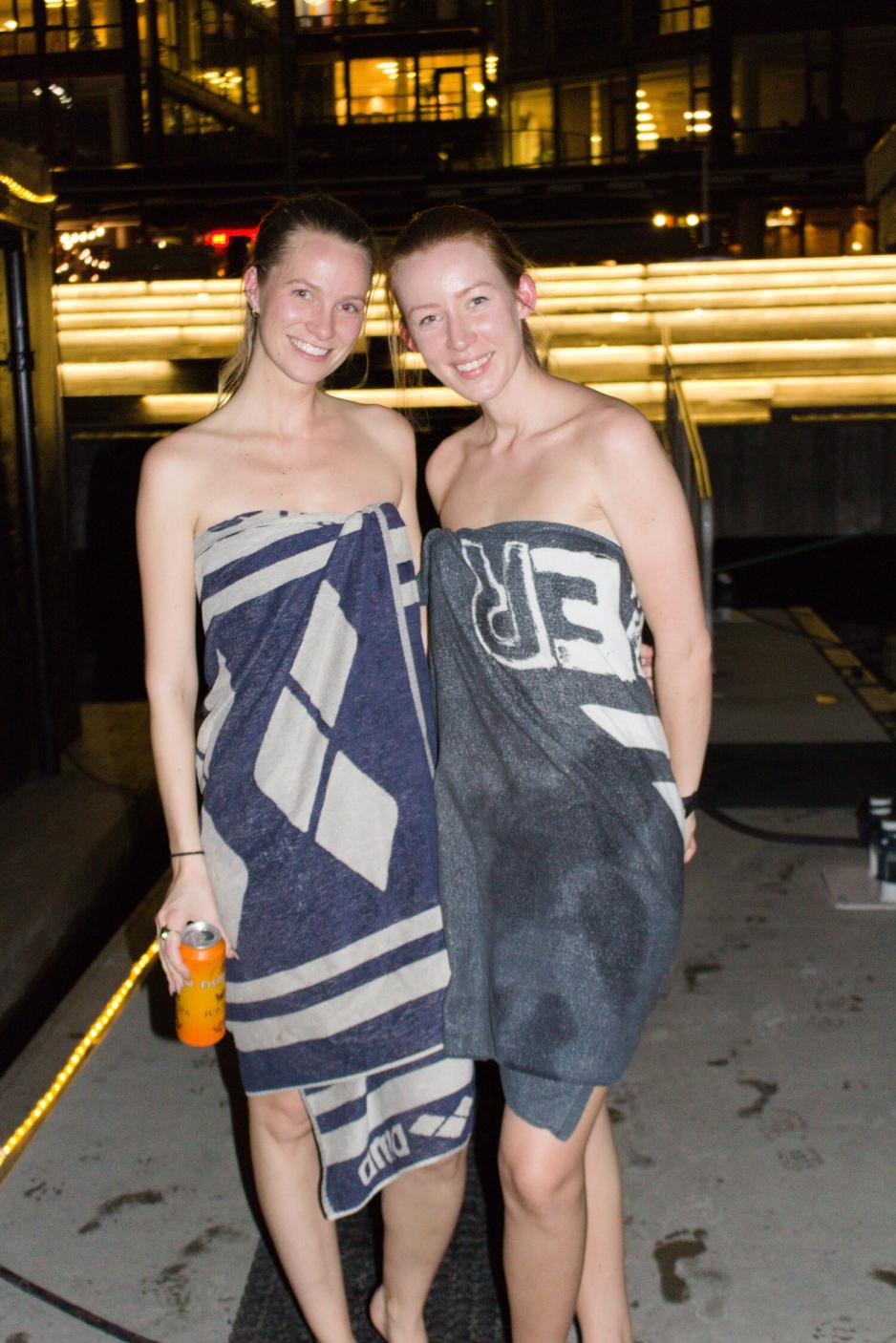 På Aker brygge er det også interesserte for ser på isbadekonkurranse. De fleste har tatt badestuer hos Oslo Fjord Spa. Blant dem er Ane Vik og Charlén Tangen.