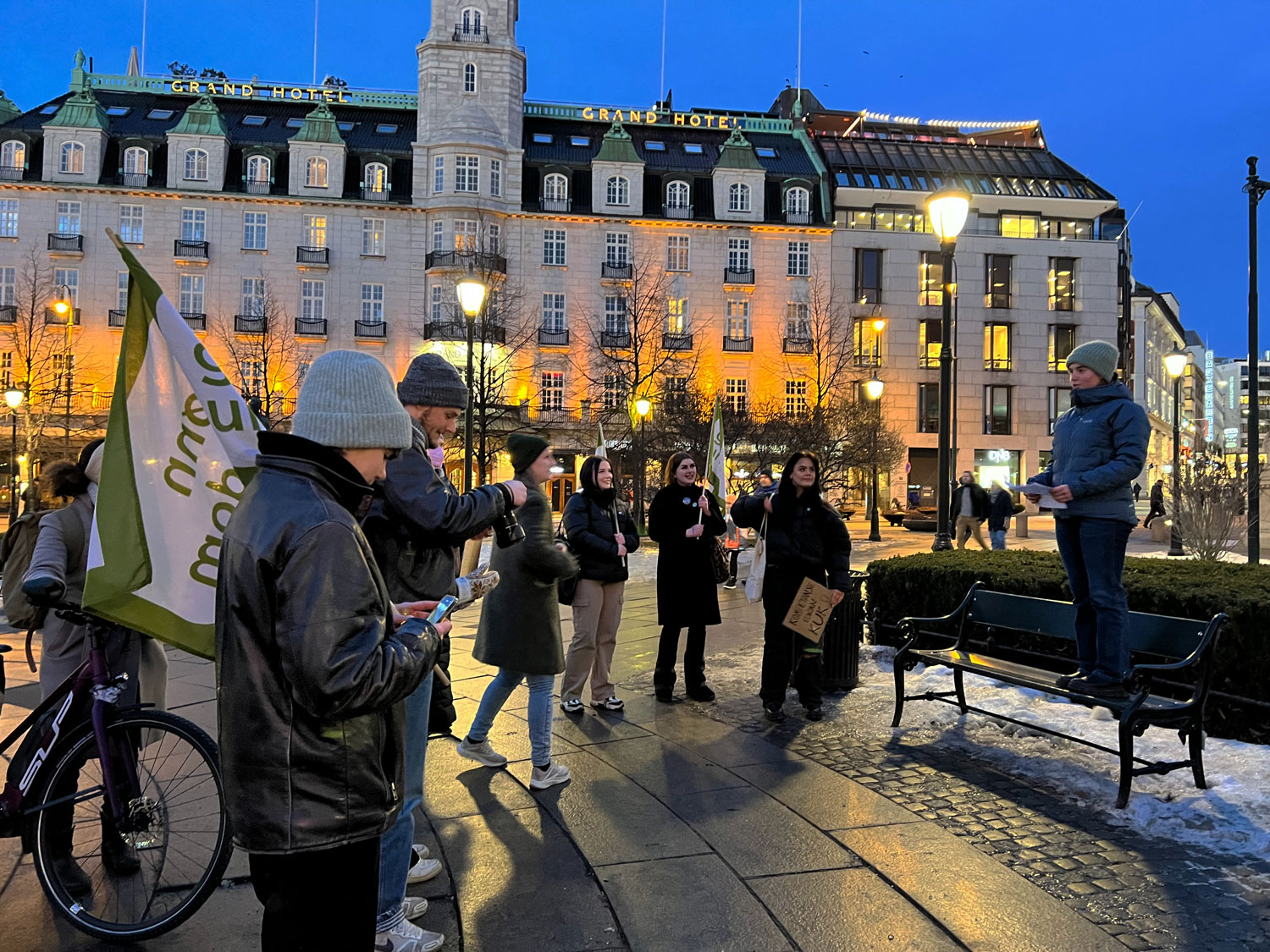 Det er Eidsvolls plass som er endestasjonen. Demonstrantene samler seg og en ung jente trer frem. Ikledd mørkeblå boblejakke og en grønn ull-lue, går hun opp på talerstolen som for anledningen er en trebenk.