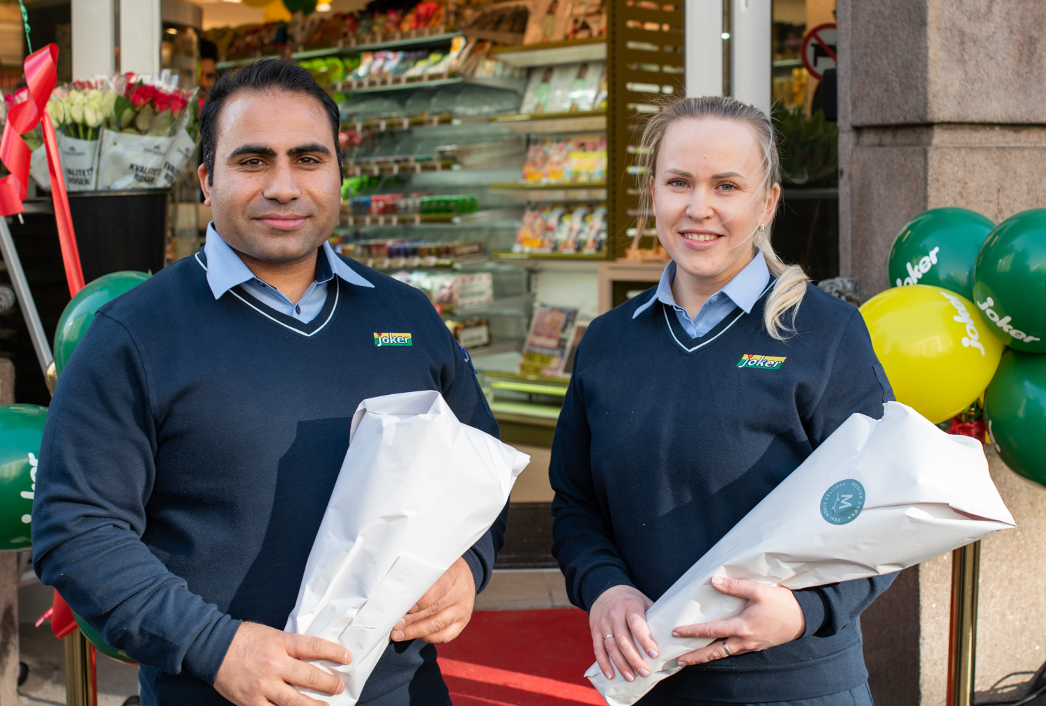 Utenfor butikken er det pyntet med ballonger og en rød løper. Det spilles musikk fra høyttalerne ved inngangen.