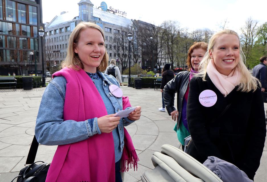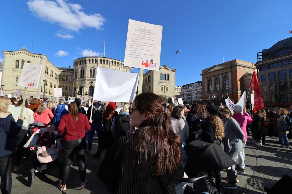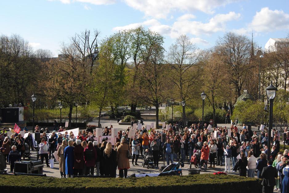 Det ljomer i høylytte stemmer utenfor Stortinget. Flere hundre tilskuere har samlet seg i sollyset på Eidsvolls plass. Det blafrer svakt i plakater og bannere med påskriften «sju krav for en bedre svangerskaps-, fødsels- og barselomsorg».