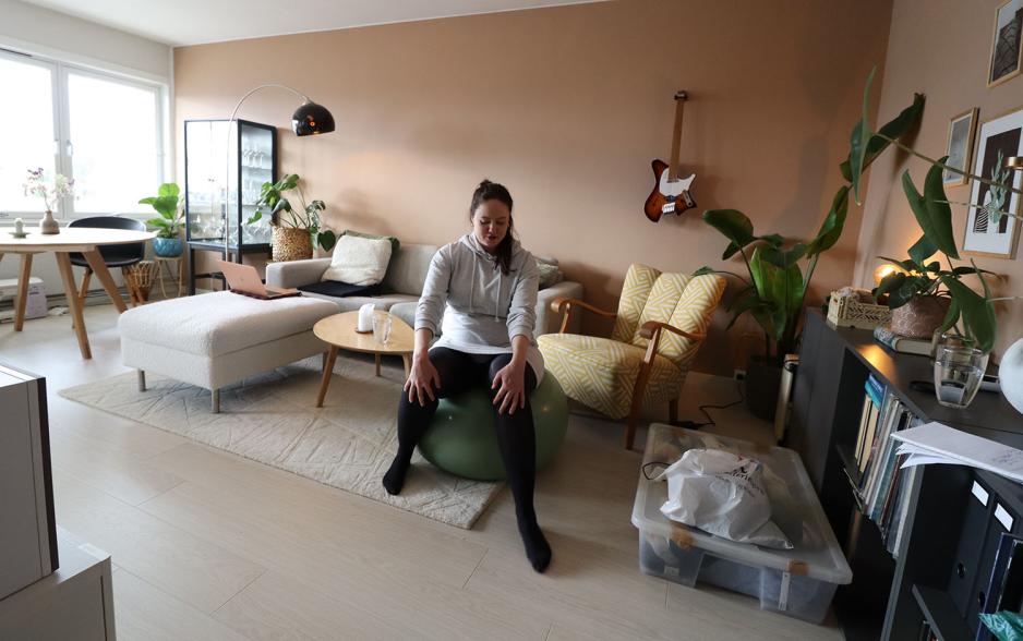 I en blokkleilighet nord i Oslo har Barbro Salte satt seg på en spesiallaget pute på sofaen. Puten er et kjærkomment hjelpemiddel i hverdagen med bekkensmerter.