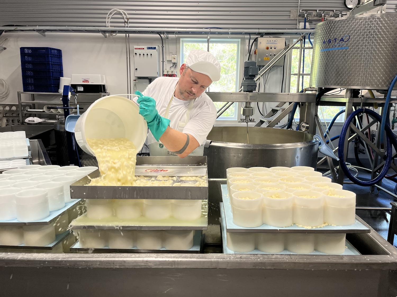 Kniven går på tvers, på langs og rundt i blanding som har gått fra fløte og melk til å bli fersk ost. Metallet klirrer når kniven kastes i oppvaskmaskinen. Vannkranen knirker og vendes mot venstre, og ystetanken fylles med vann slik at osten ikke syrner.