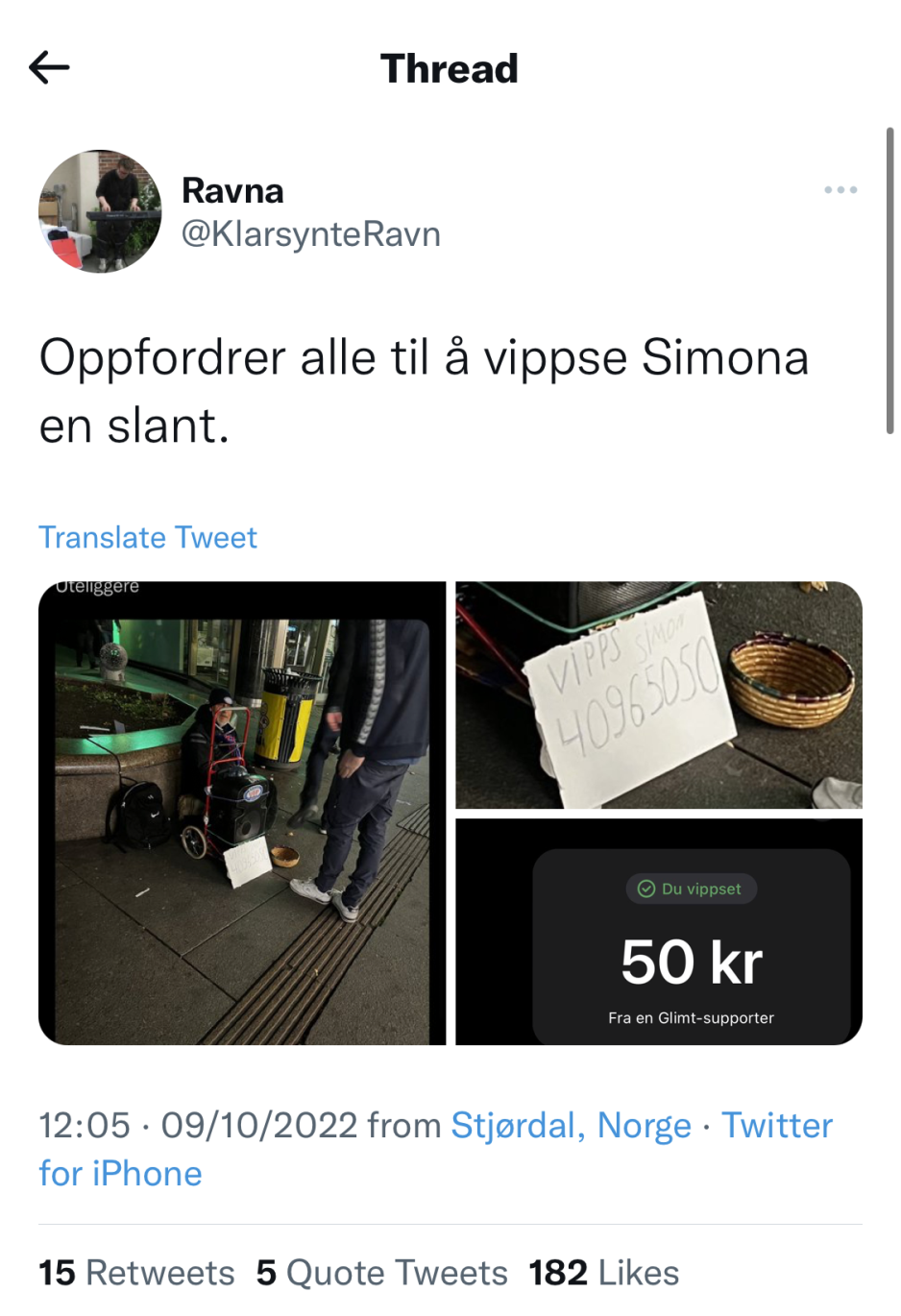 – Utover det så vil jeg skryte veldig av våre supportere og ikke minst hele supporter Norge som har støttet vedkommende med Vipps-overføringer.