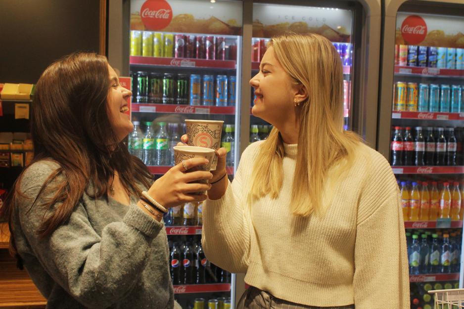 Amalie Årtun (22) og Sigrid Øverby (21) står med hver sin kaffekopp i hånden og er dermed klare for å gripe dagen.