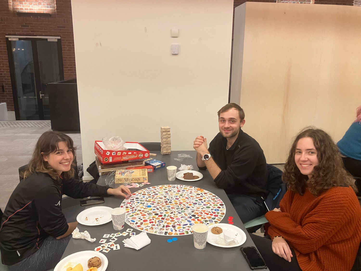 Studenter, for det aller meste - hvis ikke utelukkende. Journalen fikk ikke snakka med alle, men noen - bl.a. Leart, Rikke og Frida. De satt og spilte Star Fluxx, et av sikkert flere merkelig kortspill å finne der. De er her fordi det er sosialt. Flesteparten i styret til Gaming-samfunnet var og der, noen av dem tidvis dypt inne i et strategispill med mange regler og brikker. Og så var det utvekslingsstudentene Nahia (20), Francesca (22) (fra Spania) og Thibaut (23) (fra Belgia). De to spanjolene er blitt kjent her i Norge, på studiet: farmasi på UiO. Francesca og Thibaut møttes på et annet SiO-arrangement for en tid tilbake. I kveld har de spilt det spillet der man setter opp et tårn av treklosser, og så går man på rundgang med å trekke ut en og en kloss, helt til noen velter tårnet - og så en liten runde Vildkatten før de dro.