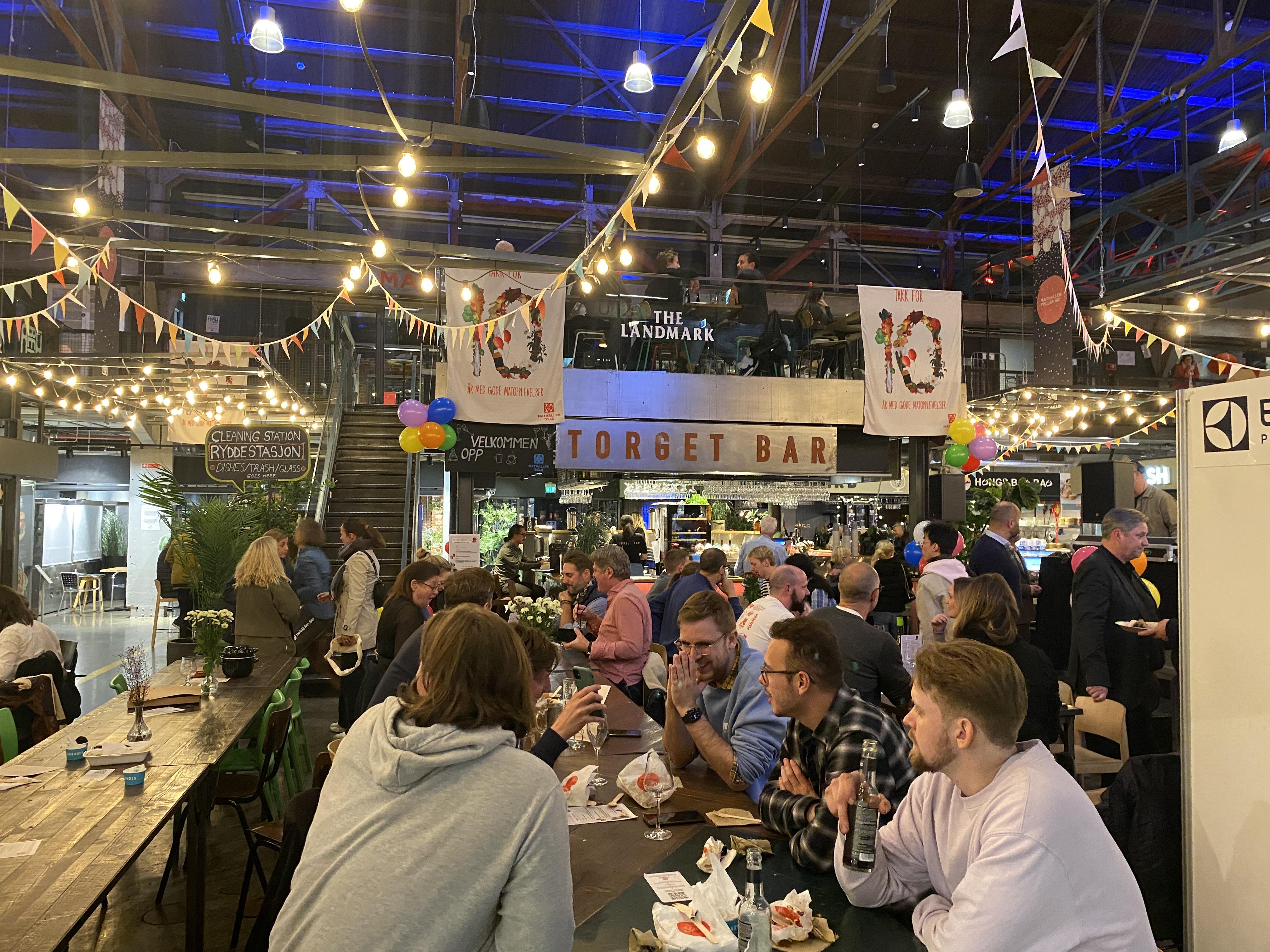Kaker, ballongar, smaksprøver, stjernekokkar, DJ og fullsett hus. Mathallen feira ti år på Vulkan.