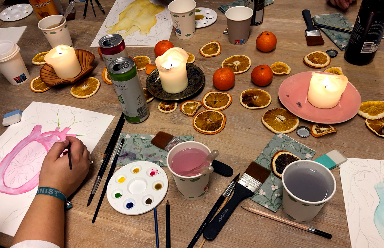 Noen hadde øl, noen tok med sider og noen drakk kaffe når de skulle lære seg grunnteknikkene innen akvarellmaling med Tegne-Guro (Guro Ødegård). Stemningen var avslappet og samtalen gikk løst om alt og ingenting mens deltakerne forsøkte å male med de vannbaserte fargene.