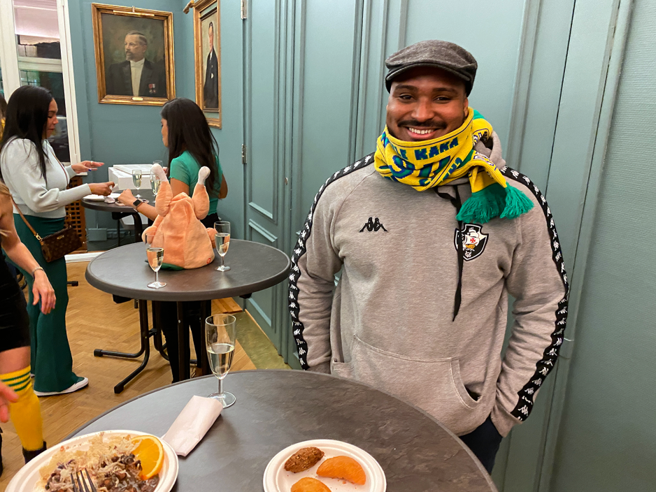 – Det er fint å være her, jeg skal nyte denne kvelden med vennene mine, sier brasilianeren mens han tar en bit av den brasilianske tradisjonsmaten og champagnen som blir servert.