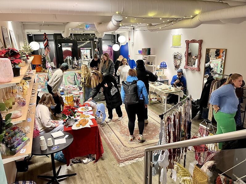 Denne søndagen hadde mange samlet seg for å handle lokalproduserte og håndlagede julegaver fra unge kreatører og kunstnere på Flokes julemarked på Grünerløkka.