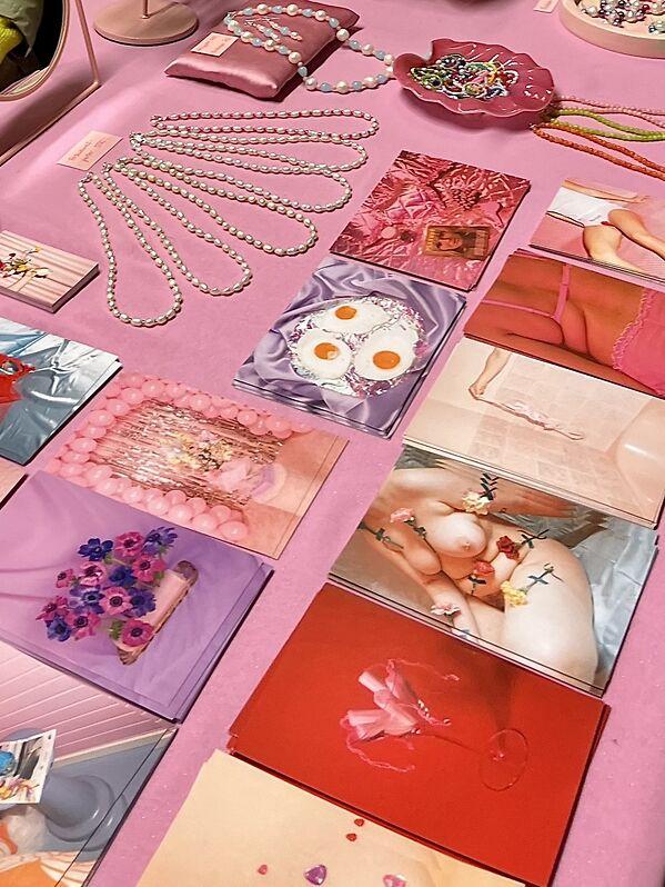 Fotograf og designer Sara Tonning bak sin markedsbod dekket med rosa duk, med postkort, smykker og et stativ med egenproduserte håndvesker i sterke iøyenfallende farger.