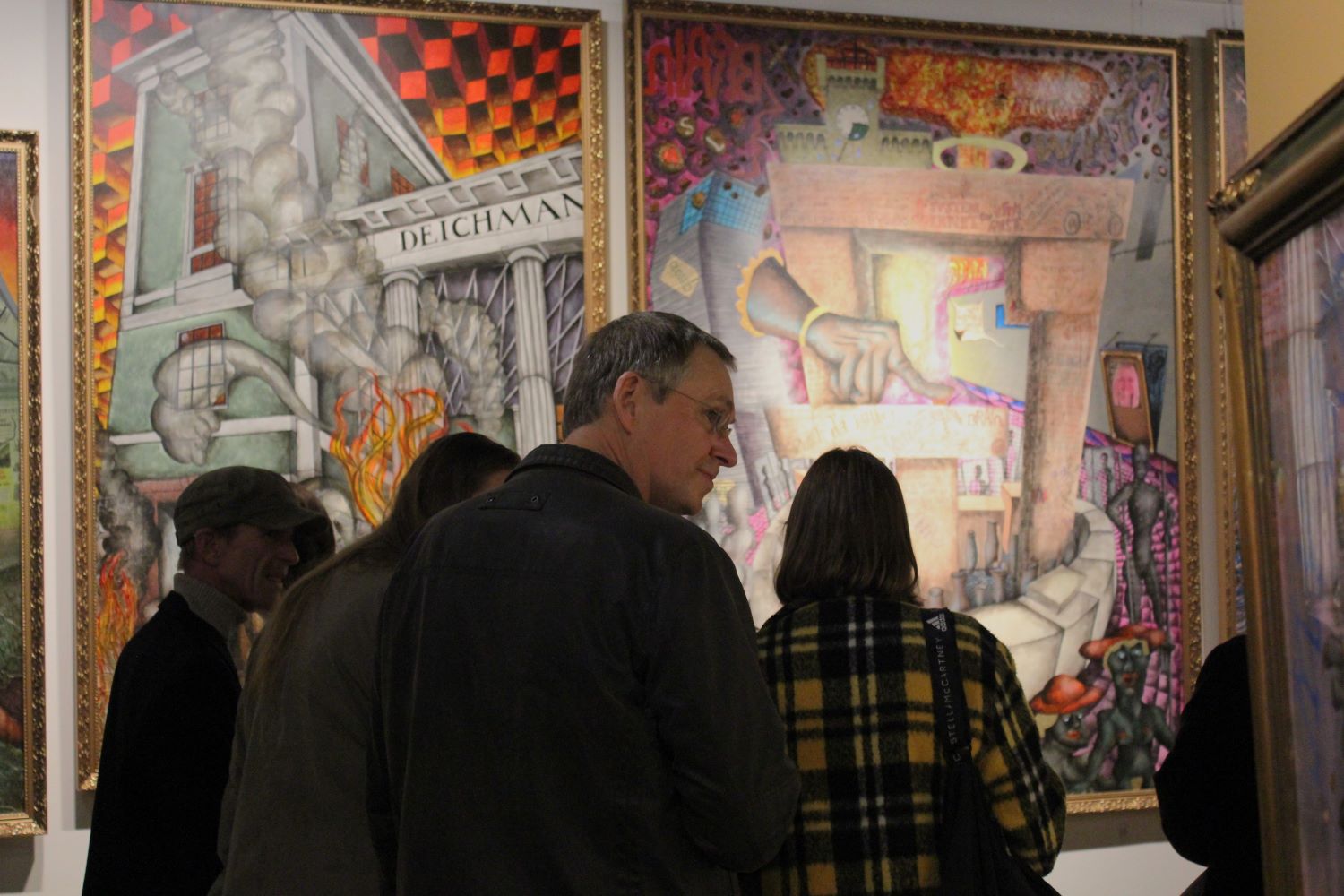 Blant folkemengden av gjester er Leopold Moltubakk, som tar seg god tid til å studere hvert enkelt kunstverk.