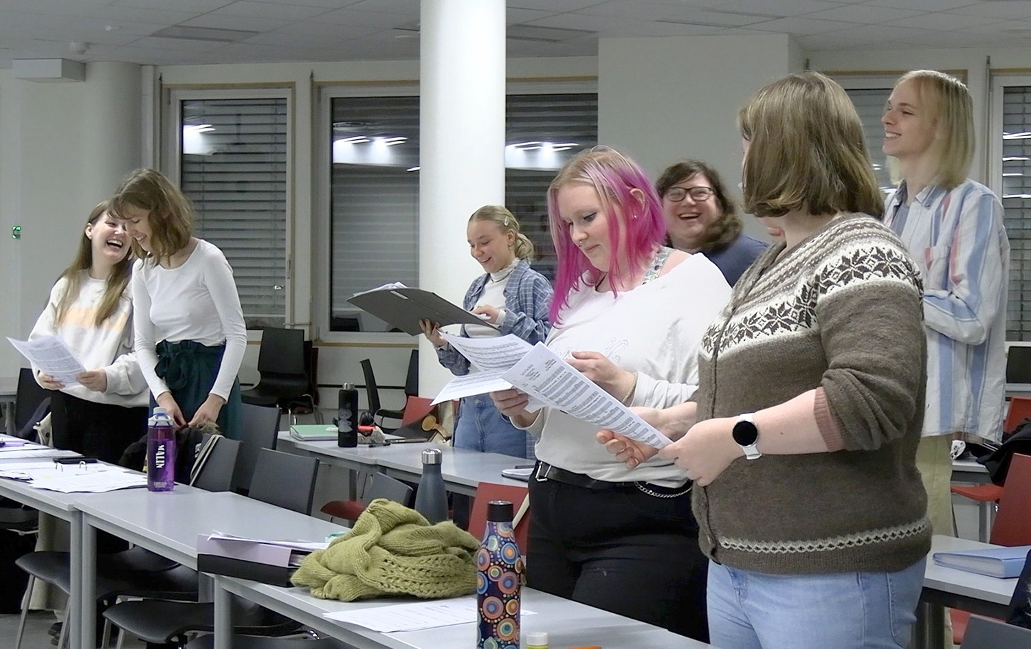 Koret Gullstrupene ved OsloMet møtes til nest siste øvelse før den planlagte julekonserten. Å synge i kor kan bidra til å redusere angst og negative følelser i en stressende eksamenstid.