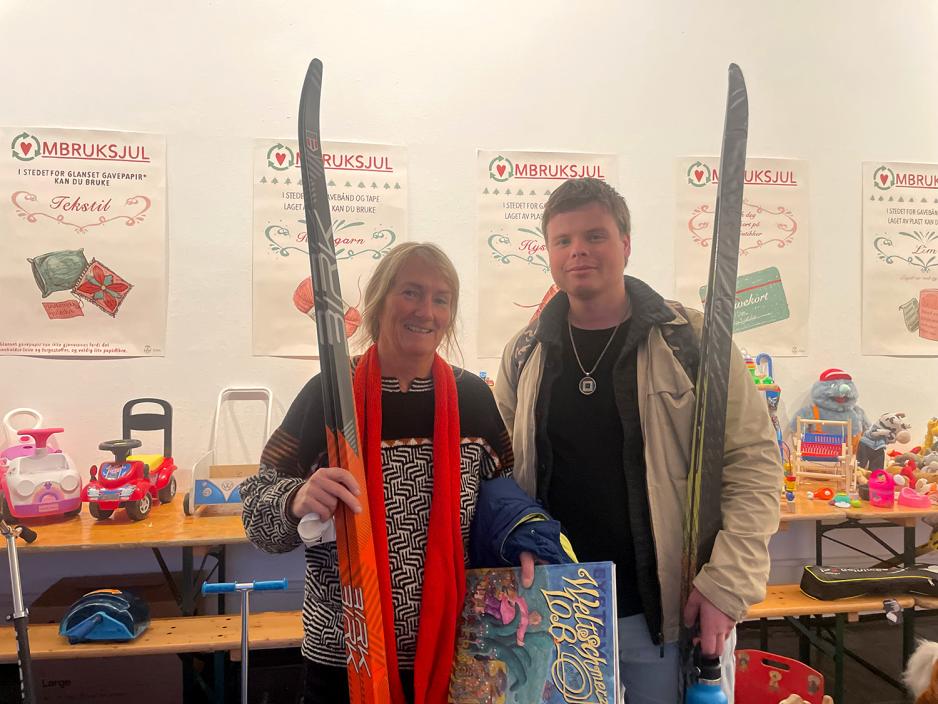 Eggen har nettopp fått seg et par pent brukte langrennski på det lille bruktmarkedet. Sammen med familievenn Anne-Kristin Rolstad har de tatt turen til Gamle Munch-museet der Ombruksuka for fullt er satt i gang. I dag er det inspirasjonsdag for maling og oppussing som er på agendaen.