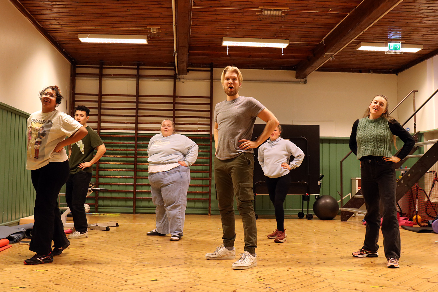 Den grønne gymsalen fylles av latter fra gruppa, før instruktør Hilde tar over med en klappende takt og Lisa Svinø setter i gang med en ny sketsj. De andre følger ivrig med som tilskuere fra sidelinjen, og heier frem kollegaene sine med “Nice!” og “Fy fader!”.