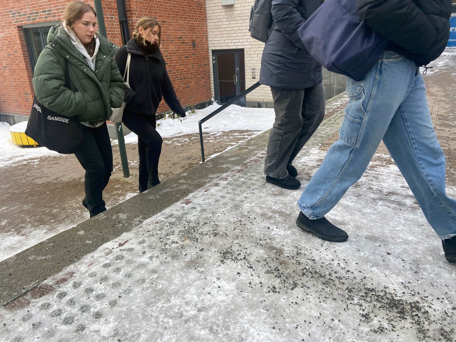 På grunn av den skiftende temperaturen har snøen smeltet på dagtid, for så å fryse til igjen. Dette fører til at det blir glatt is flere steder på campus.