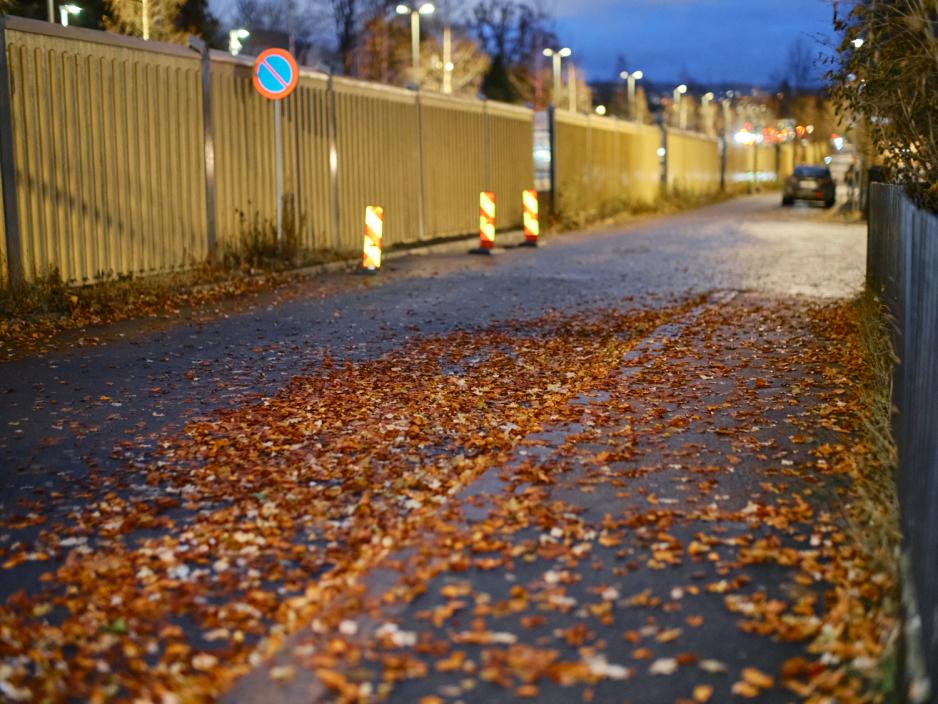 I sykkelveien mellom Smestad og Borgen stasjon, bak støymuren mot Sørkedalsveien, har det samlet seg en stor mengde blader i veien.