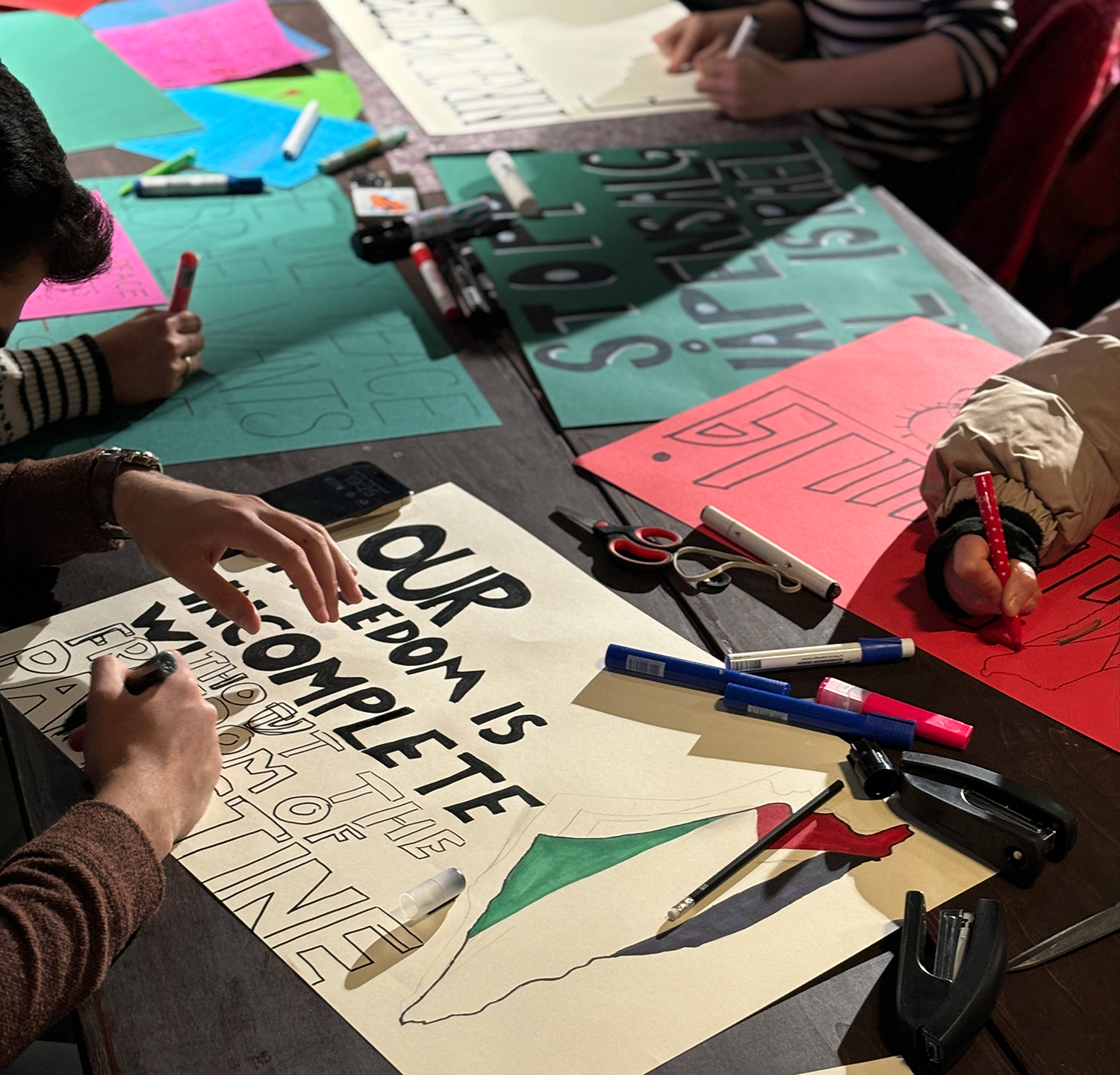 Denne kvelden har palestinakomiteen invitert til aktivistverksted på Melahuset, hvor det lages blant annet banner, t-skjorter, stensiler og plakater som kan brukes i demonstrasjonene framover.