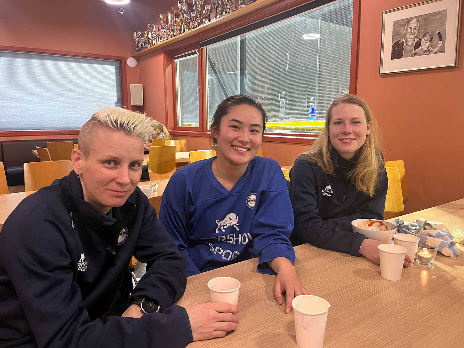 Tirsdag kveld hadde de en slik samling. Damelaget spiste tomatsuppe sammen med de yngre jentene i klubben, som nettopp hadde hatt trening ute på isen.