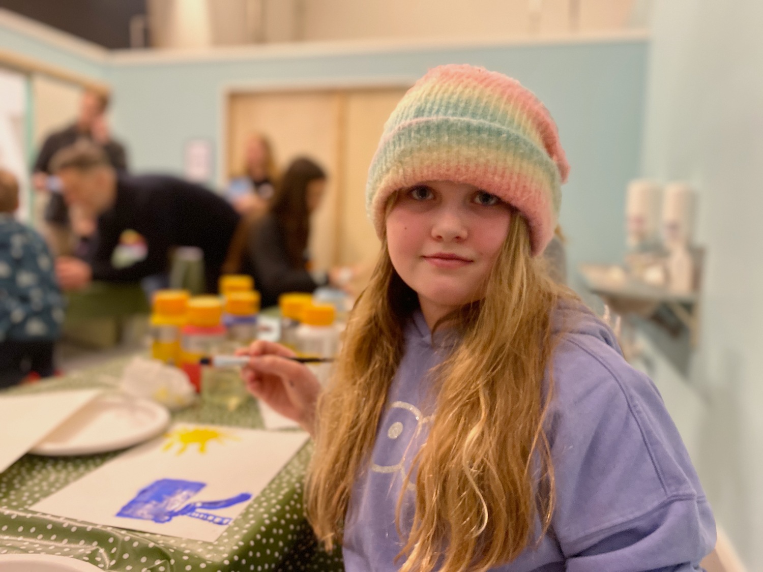 Thale på 8 år forteller at hun synes museet er spennende, og at hun nå skal lage et maleri til venninnen sin.