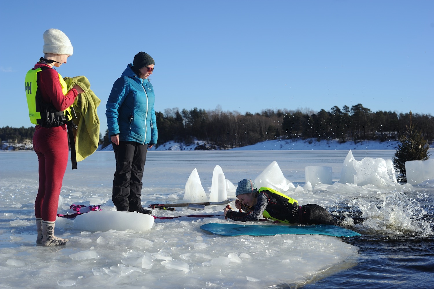 Bade får til slutt kontroll på pusten og får med det lov til å komme opp fra det iskalde vannet. Hun setter piggene hardt i isen og sparker seg opp på land. Makkeren står klar med et håndkle.