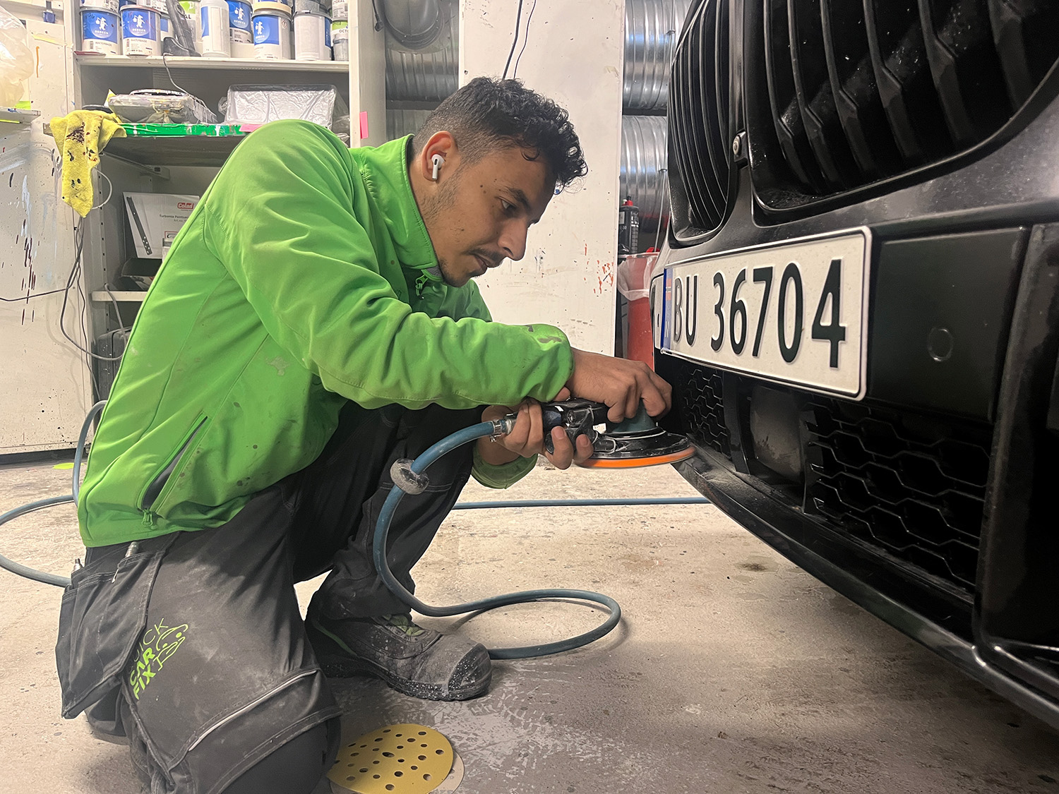 – Jeg retter opp ting på bilene, grunner dem, sliper, lakkerer og så polerer jeg. That´s it, og jeg har god kontroll på det, forteller Alkhattab stolt, mens den ene bildelen raskt blir byttet ut med en annen.