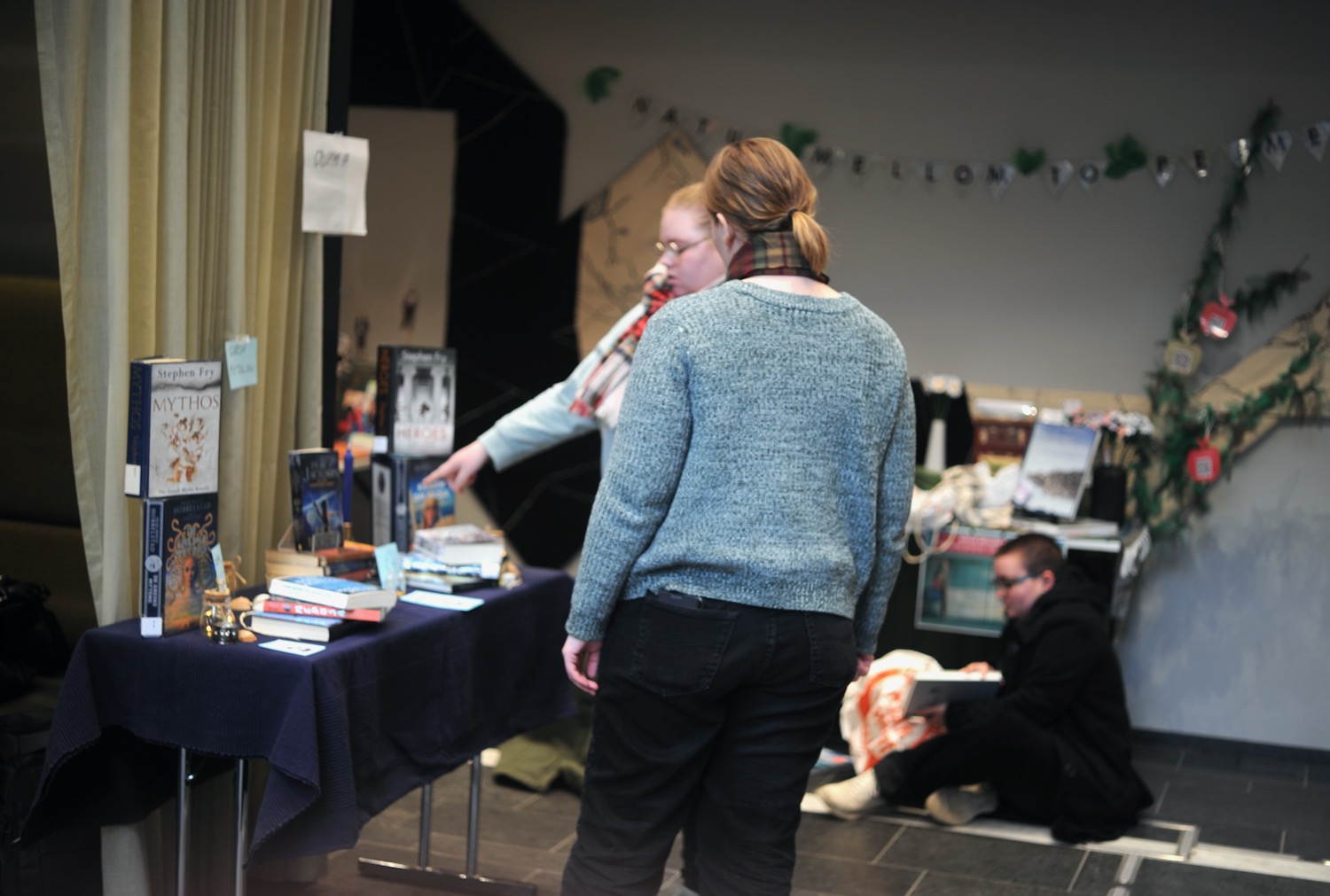 Det sier student Cecilie Steinsland (50). Hennes gruppe stiller ut et utvalg av vampyrbøker ved bygningens inngangsparti.