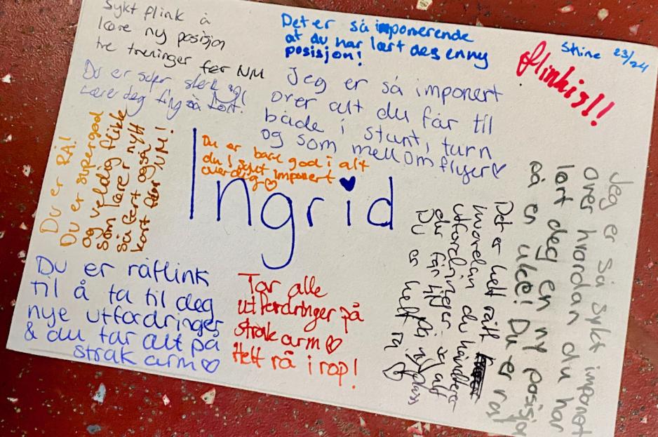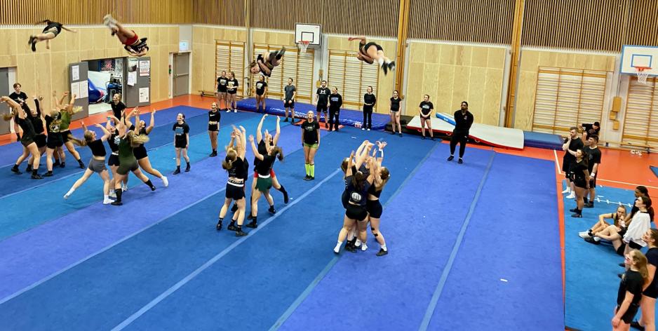 Gymsalen på Frydenberg skole er fylt opp med ivrige utøvere, siste trening før NM. Lagene er godt i gang med "full outs". Det er en fast rutine for klubben, hvor flere lag samles i hallen for å heie på hverandre og skape samhold.