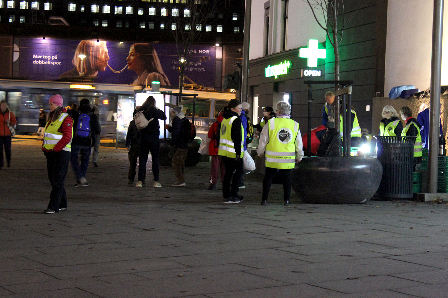 Til sammen er de åtte stykker i selve teamet, men det er mange på lista over frivillige som er interesserte i å hjelpe. Frivillige kan melde seg opp til hvilke onsdager de ønsker å være tilstede på Jernbanetorget. De hjelper til i de forskjellige avdelingene, står vakt og følger med, går en runde med matposer og er samtalepartnere.