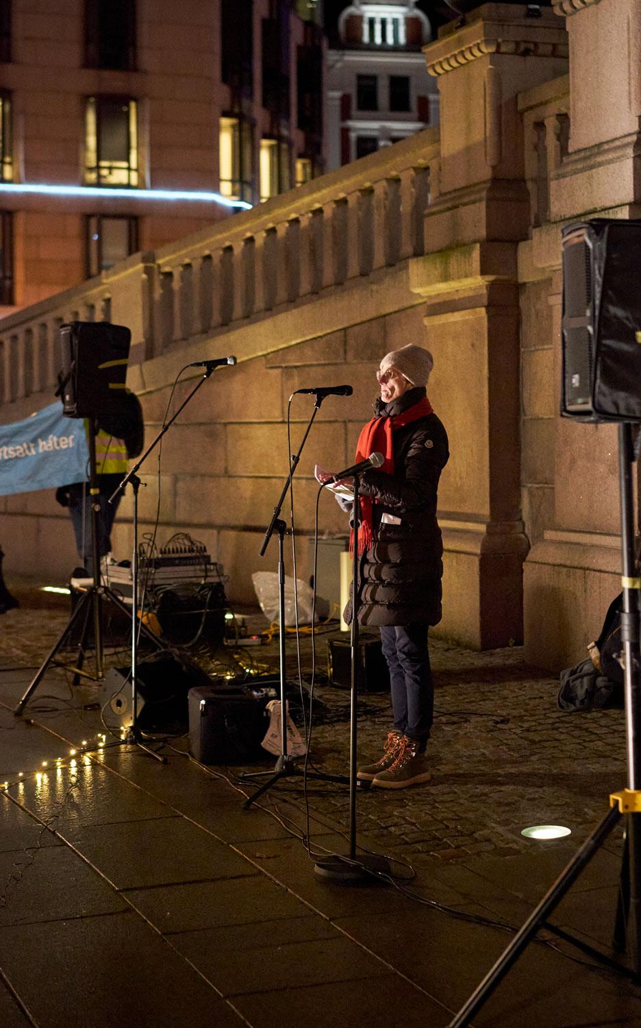 – Ja, det er jo første søndag i advent. Jeg gikk akkurat forbi Frelsesarmen sin julegrantenning på Universitetsplassen, hvor det er masse mennesker. Jeg forventer ikke at det kommer like mange mennesker hit, men det er viktig for oss å markere dette og ikke glemme flyktningene som befinner seg rundt om i Europa, forteller Birgitte Lange.