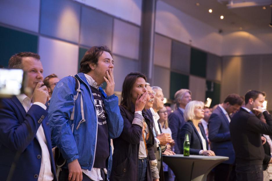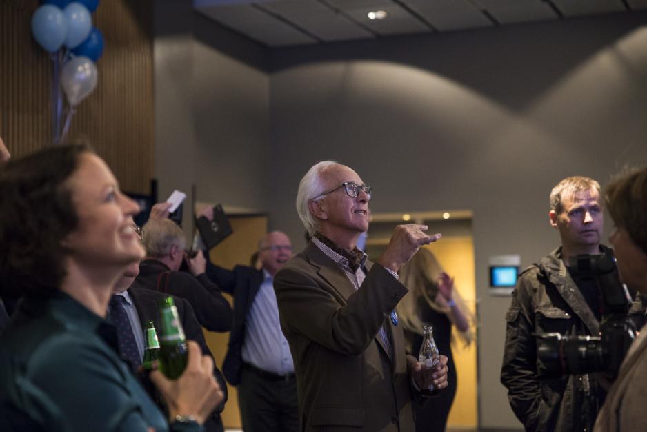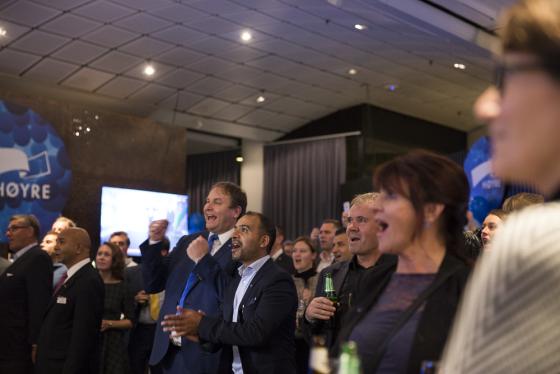 Høyre-medlemmer holder pusten i det valgdagsmålingene tikker inn. FOTO: Camilla Alexandra Lie
