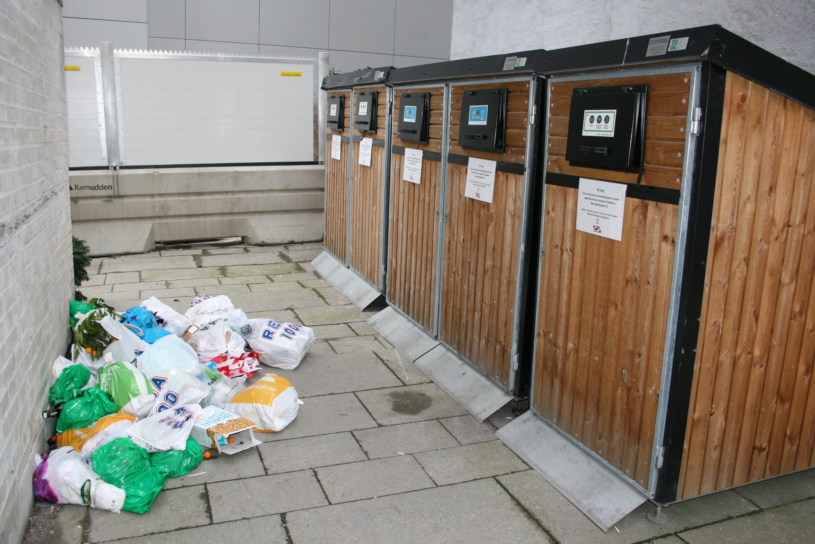 Tirsdag formiddag lå det mye søppel rundt miljøstasjonene til St. Hanshaugen studentby. Allikevel er studentene som bor der fornøyde med miljøstasjonene.