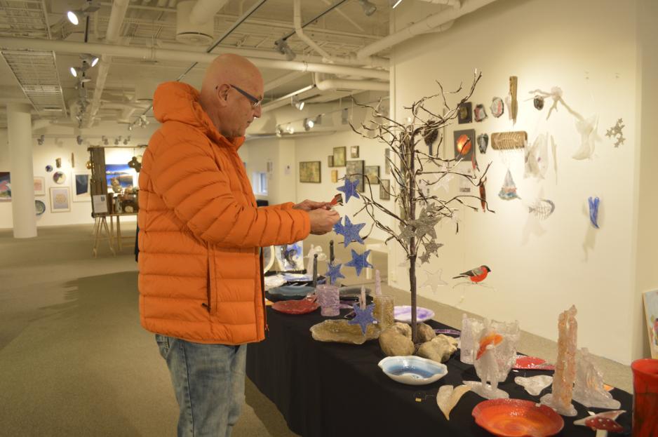 – Min kone forelsket seg i denne, sier han til Kristin og viser fram en figur i pleksiglass. Nå skal han kjøpe det til henne.