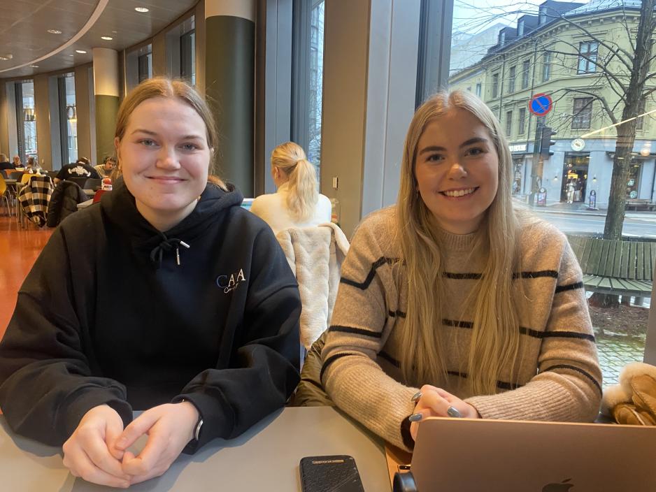 Marie Ekren (20) og Emma Isaksen (21) studerer grunnskolelærer 5-10. trinn ved OsloMet. De synes at det burde bli gratis sanitetsprodukter på OsloMet sine toaletter også.