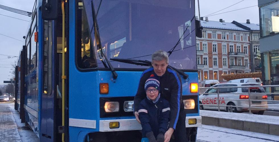 Gutt hjelper trikkesjåfør i rushtrafikken