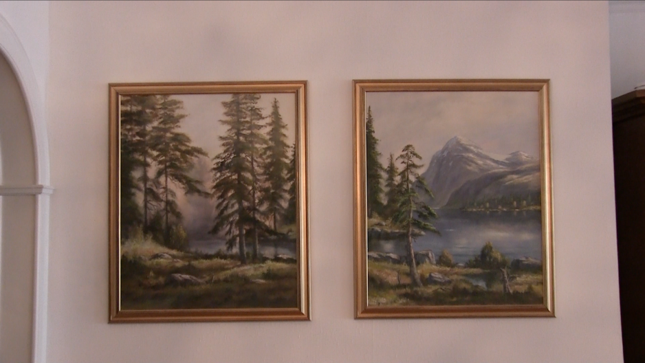 Han peker på to malerier på veggen i gangen, de eneste han har hengende oppe.