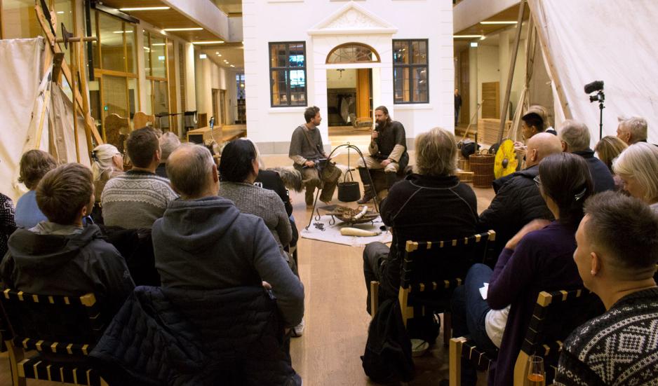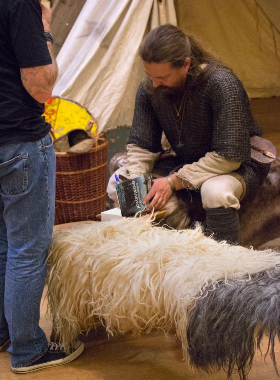Inne hos Gyldendal var det et voksent publikum og rundt 30 personer, som var vitne til en vikinginspirert aften i forbindelse med lanseringen av den tredje boken i Jomsviking-serien. Bøkene er skrevet av Bjørn Andreas Bull-Hansen. Det var satt opp en utstilling av hjelmer, våpen, horn og andre orrøne gjenstander. Kvelden startet med at en person i fult vikingkostyme blåste i horn, etterfulgt av flere som slo våpen mot skjold for å markere åpningen. Publikum ble godt tatt imot og fikk servert mjød og byggrynsgrøt med sukker og kanel, til tross for vikingenes protester.