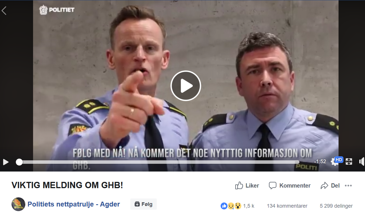 "Politiets nettpatrulje – Agder" la ut en video på Facebook der to politimenn informerer om det narkotiske stoffet GHB.