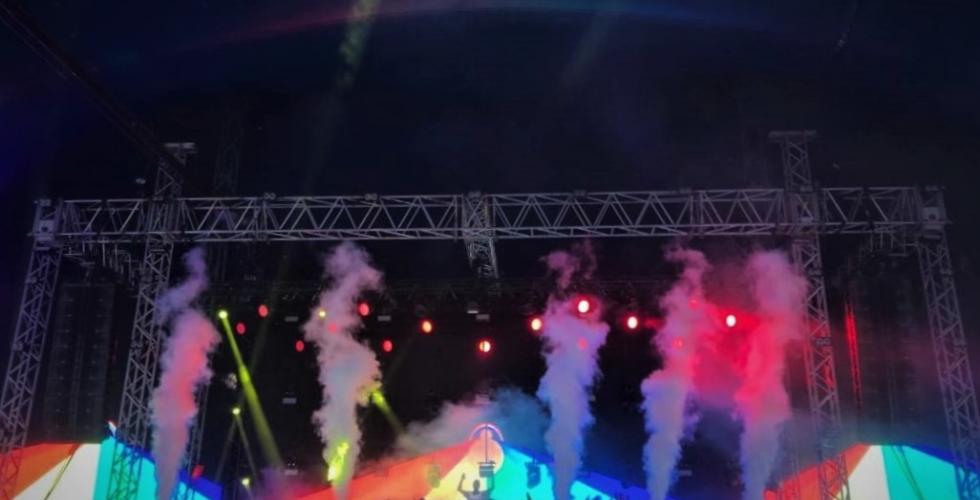 Dragartisten Monetta Leone syng på scena i raud kjole.